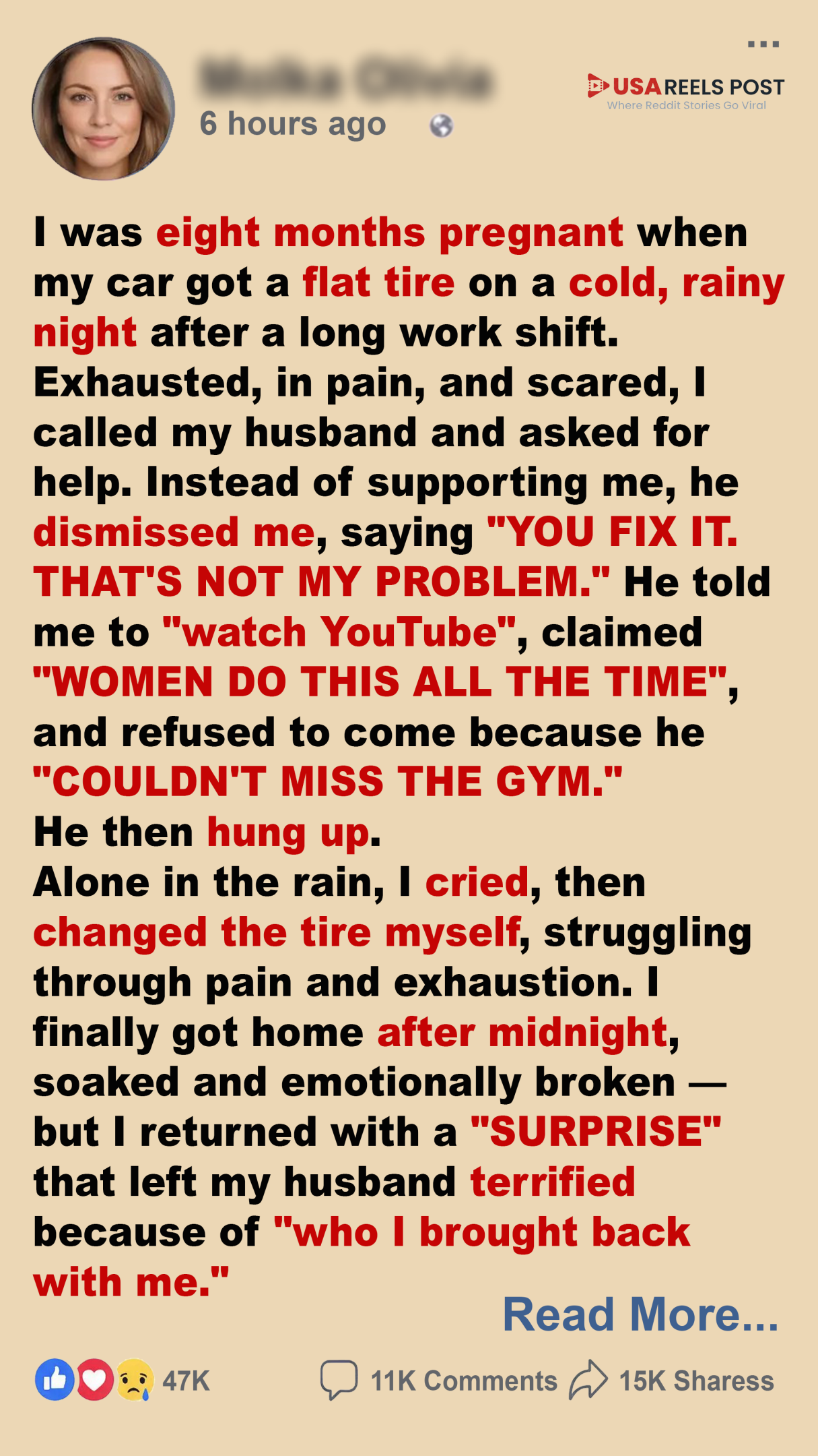 “Three nights ago, Ava was stranded in the rain with a flat tire. She is eight months pregnant, was alone, and exhausted. She called her husband, my son, for help. He told her to watch a video and fix it herself.”