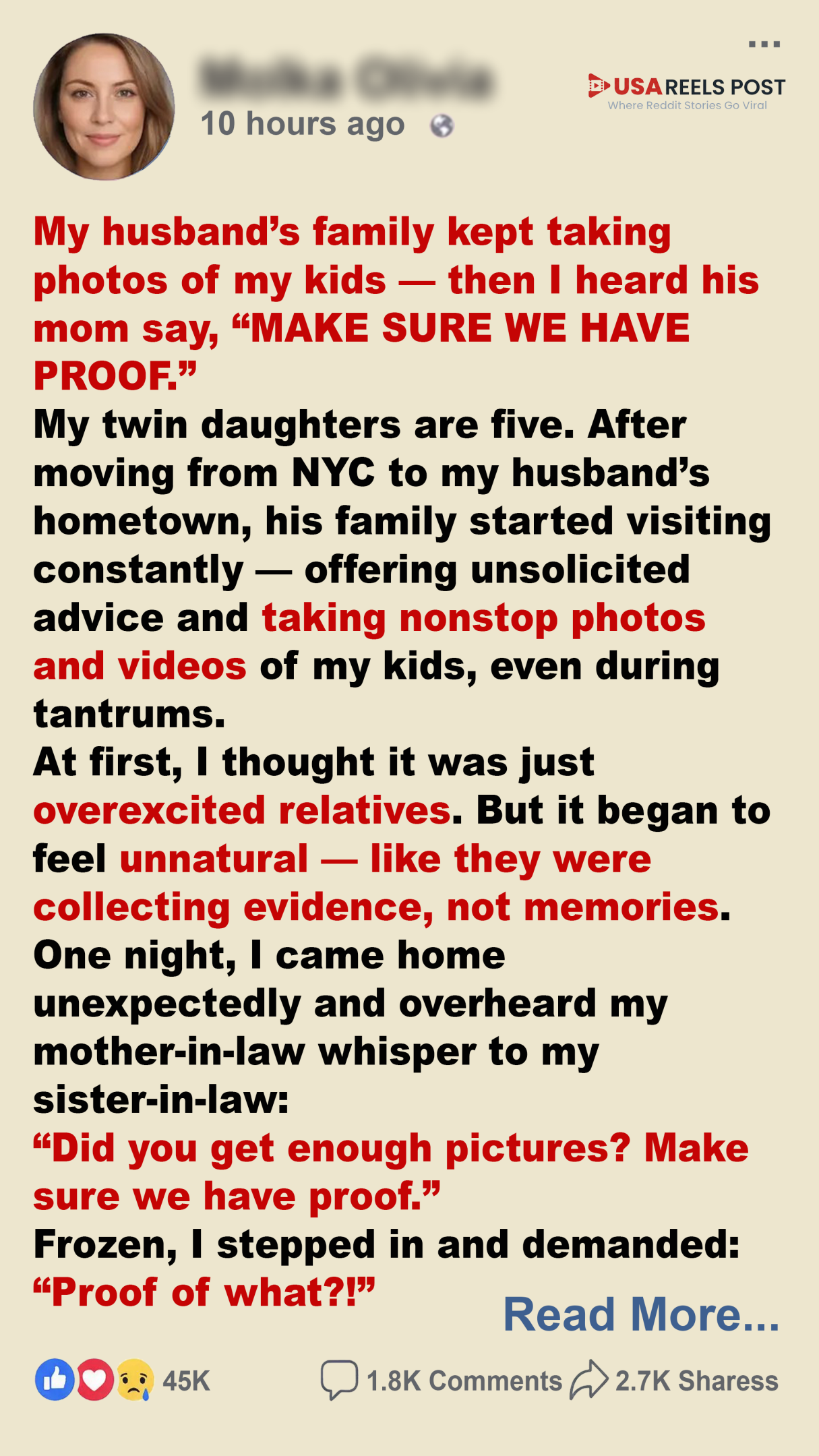My husband’s family took constant pictures of my daughters. Photos of tantrums, messy hair, and videos of moments I thought were private. When I overheard my mother‑in‑law whisper, “Make sure we have proof,” I realized they weren’t collecting memories. They were plotting something terrible.