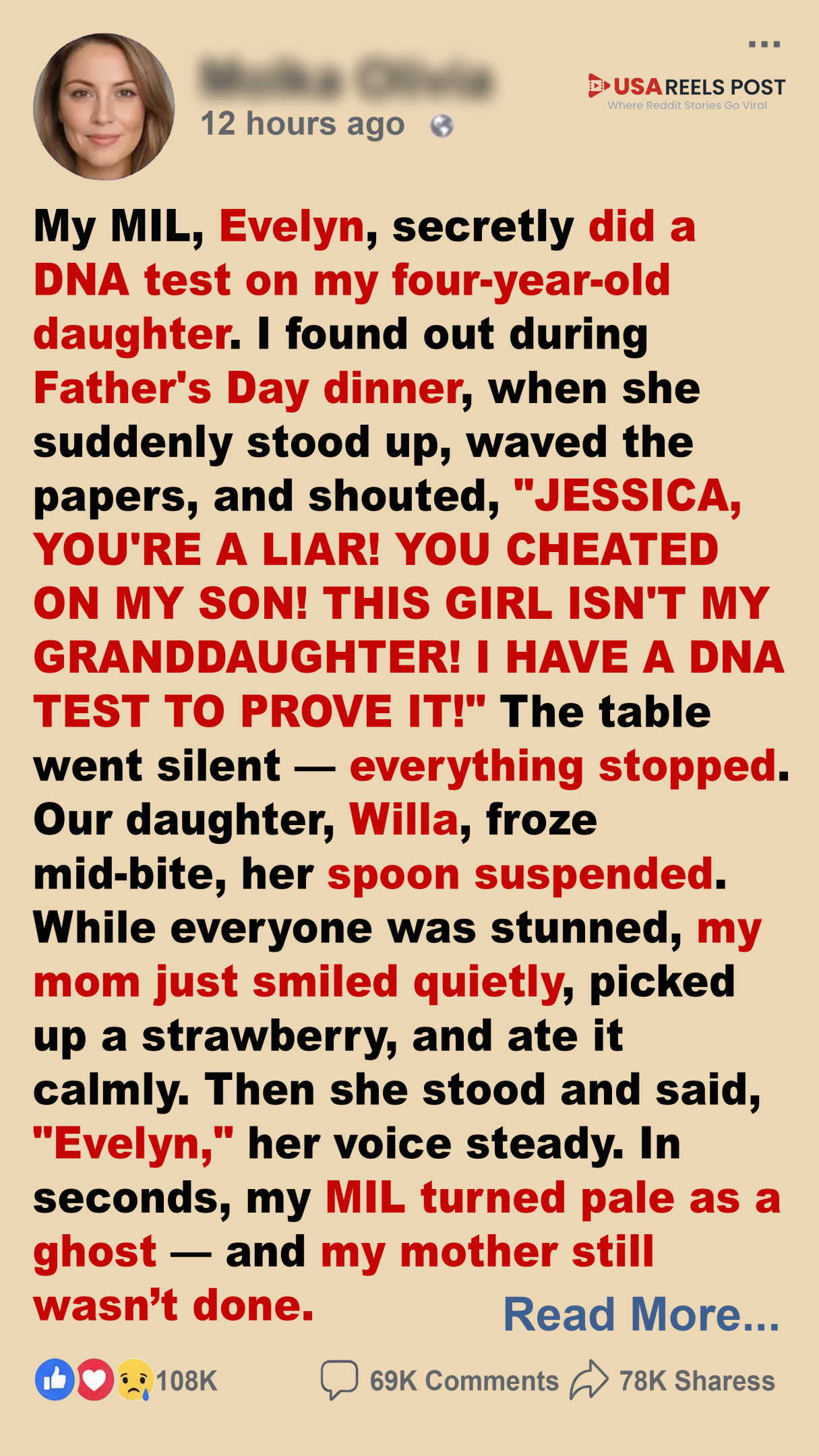 “You cheated on my son. That girl,” she stabbed the air toward Willa. “… that child is not my granddaughter. And I have a DNA test to prove it!”