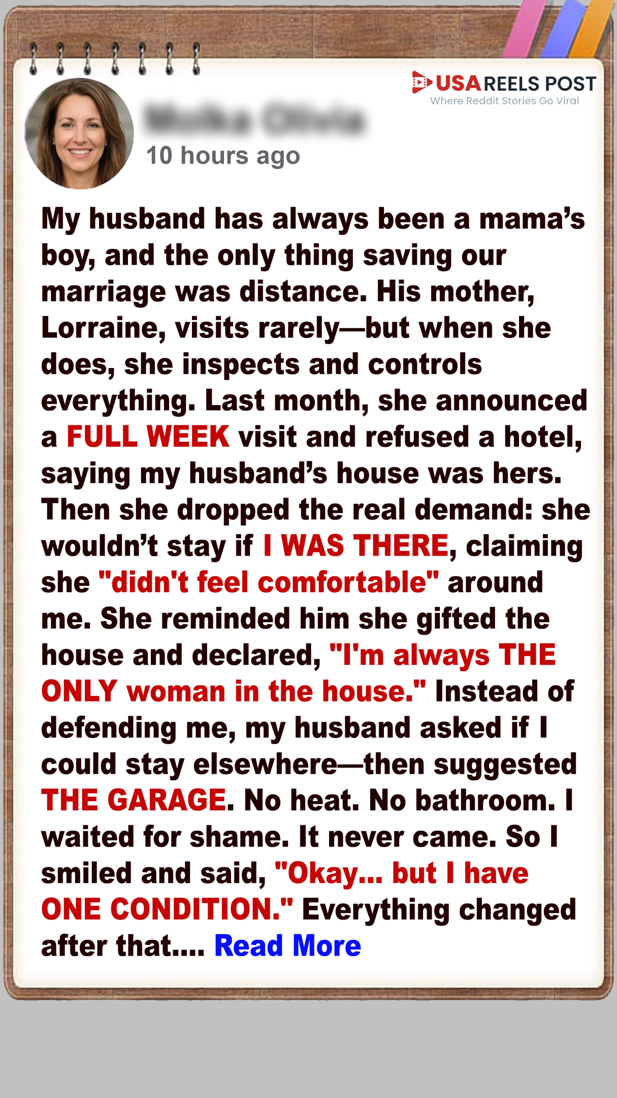 My husband asked me to sleep in the garage while his mother stayed in our house because she “didn’t feel comfortable” around me. I thought he was joking — he wasn’t. So I agreed, on one condition.