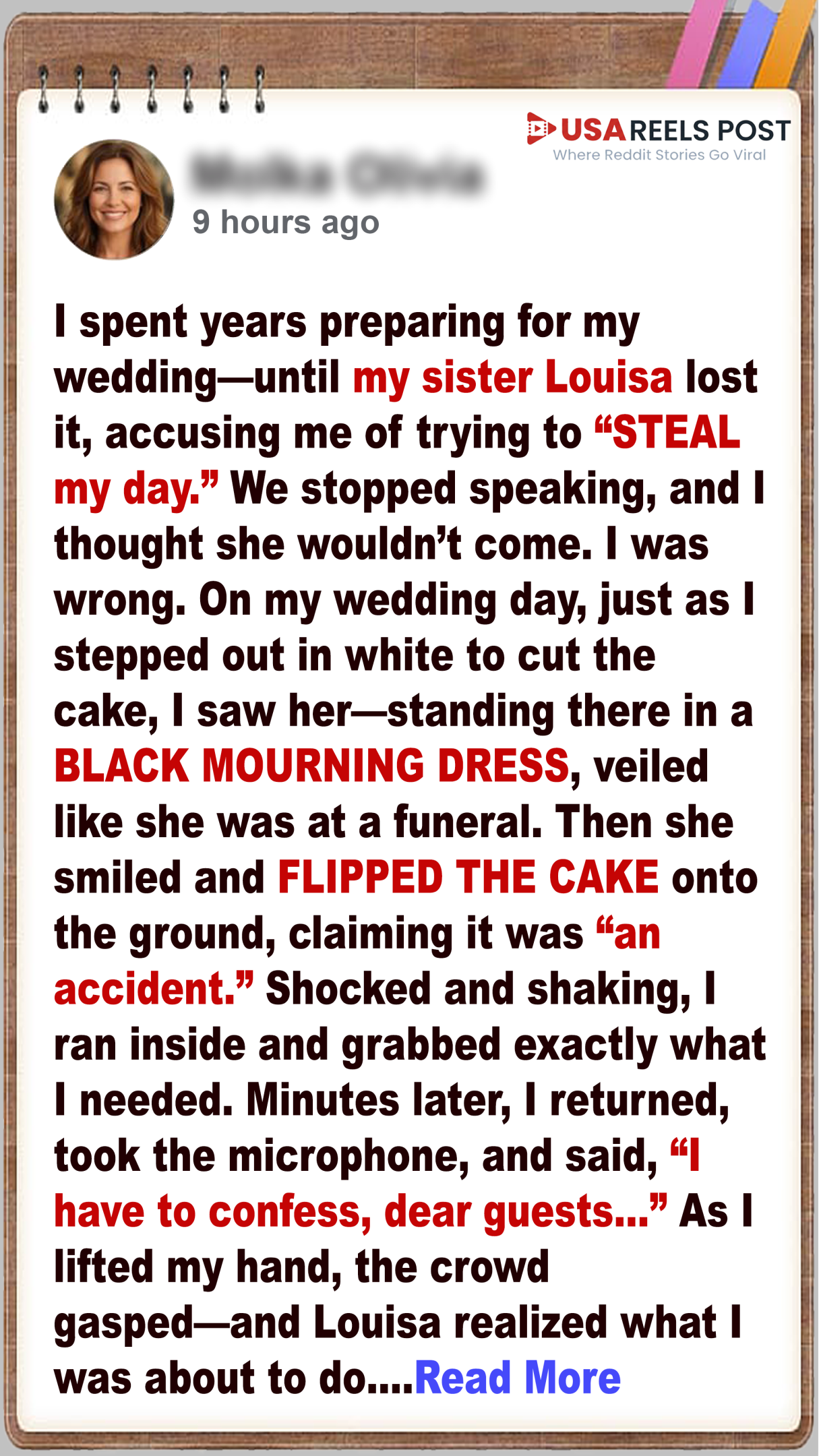 She stood by the cake in a black mourning dress, with a dark veil over her face. The fabric clung to her in a dramatic way, heavy and deliberate. She looked as if she were at a funeral, not her older sister’s wedding.