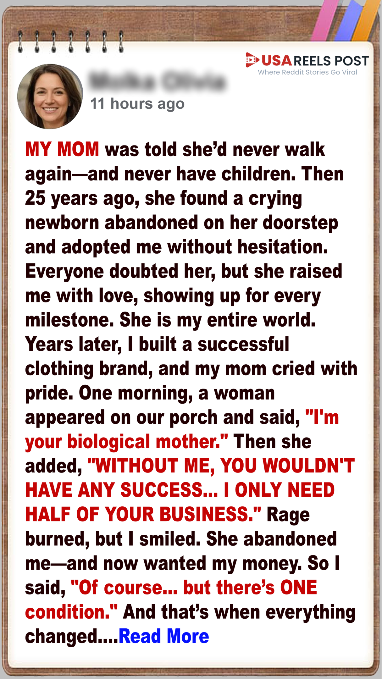 “Sweetheart, you do realize that without me, you wouldn’t have any success, right?” she said. “I’m the one who made sure you were raised by this woman so you’d turn out well. I only need half of your business. That’s fair.”