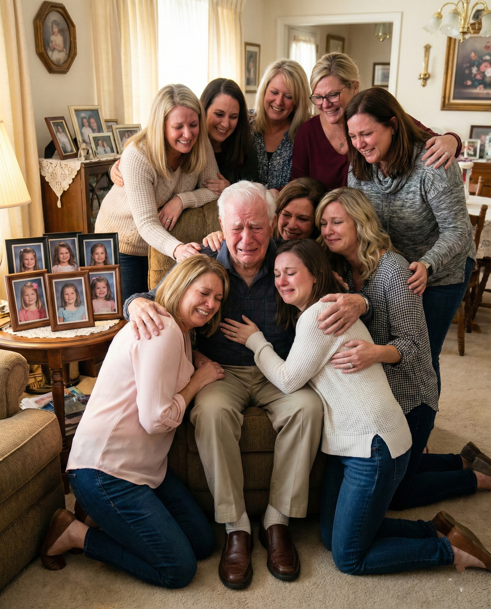 In 2025, forty-six years after that night at the orphanage, Richard sat frail but proud in his favorite armchair. Around him stood nine radiant women in cream-colored dresses, their hands resting gently on his shoulders, faces glowing with pride. Cameras clicked, headlines read: “In 1979, he adopted nine abandoned girls. See them now.”