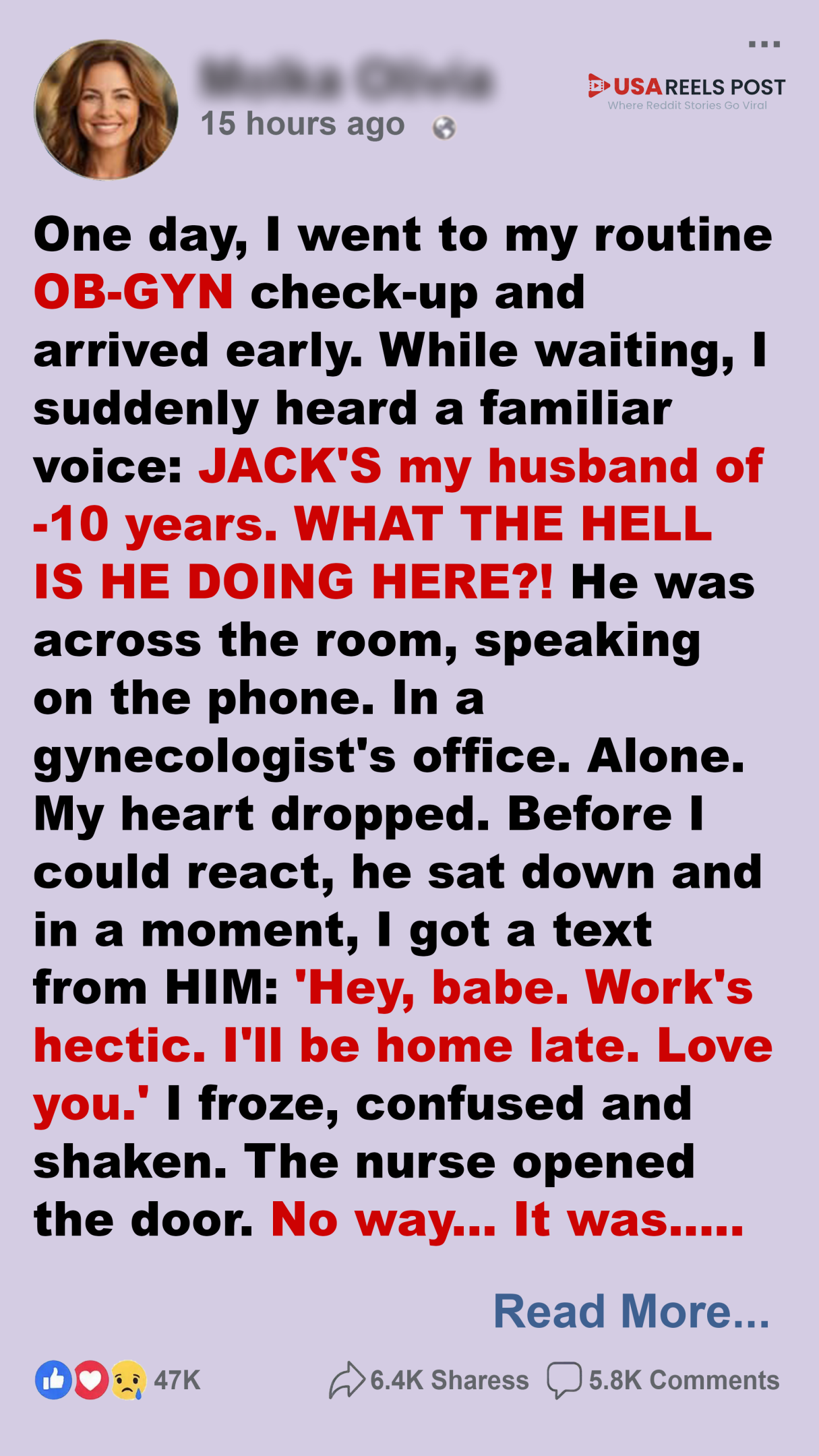 I was in the hospital waiting room for my annual OB-GYN checkup when I heard a familiar voice. My heart froze. Just a few seats away sat my husband, Jack, speaking quietly on his phone. What was he doing there?