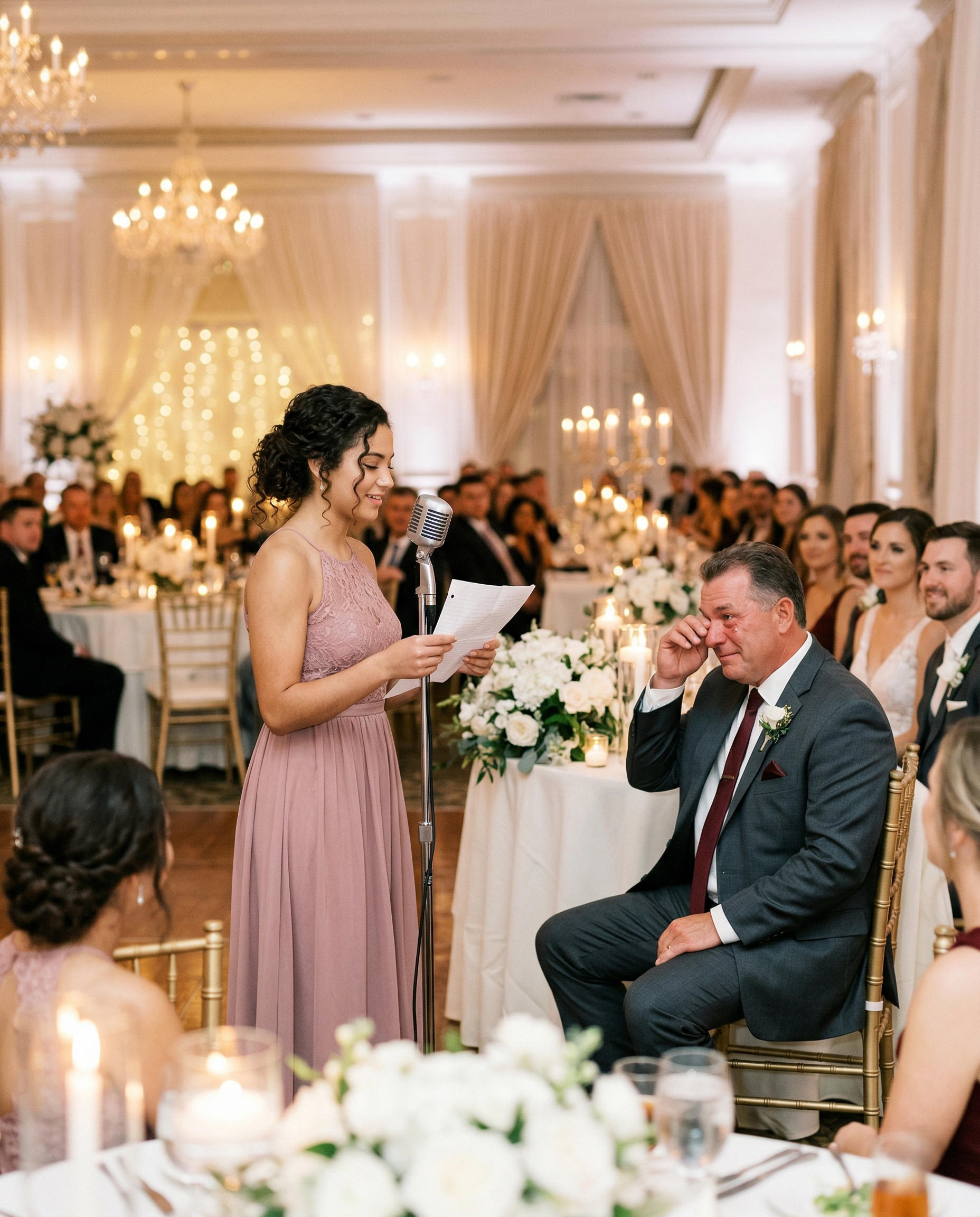 The spotlight illuminated her slightly trembling posture beside the main head table. The night of the wedding she stood up with a piece of paper that was visibly shaking in her hands.