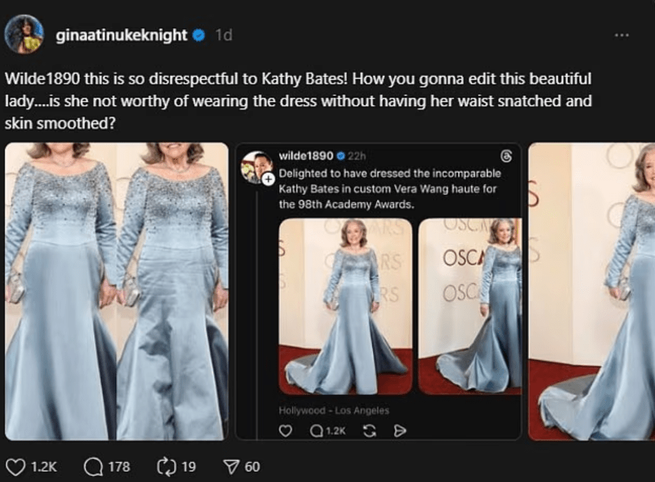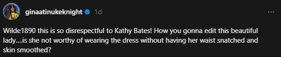 The Threads user wrote: ‘this is so disrespectful to Kathy Bates! How you gonna edit this beautiful ladyβ¦.is she not worthy of wearing the dress without having her waist snatched and skin smoothed?’