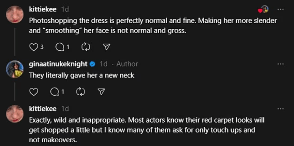 One fan wrote, ‘Photoshopping the dress is perfectly normal and fine. Making her more slender and “smoothing” her face is not normal and gross.’