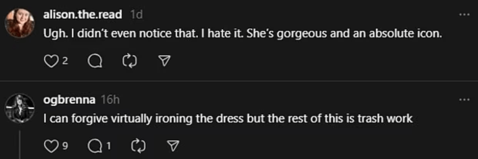 ‘Ugh, I didn’t even notice that. I hate it. She’s gorgeous and an absolute icon,’ another said, and one shared, ‘I can forgive virtually ironing the dress but the rest of this is trash work.’